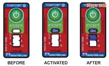 TempDot™Plus標(biāo)簽應(yīng)存儲(chǔ)在室溫下,并必須在反應(yīng)溫度閾值以上被激活。激活是通過用手指推壓。"On"字出現(xiàn)在第一個(gè)窗口中顯示激活。之后5分 鐘內(nèi),在反應(yīng)溫度或低于反應(yīng)溫度的情況下將標(biāo)簽貼到產(chǎn)品上。藍(lán)色染料熔化并以控制的速率遷移,經(jīng)過白色大窗口。這表示暴露在溫度閾值以上的累計(jì)時(shí)間。當(dāng)溫 度低于閾值時(shí),該染料固化并停止移動(dòng)。如果溫度超過閾值,TempDot®Plus標(biāo)簽提供即時(shí)的視覺跡象。