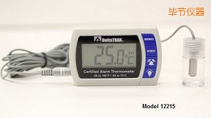 認(rèn)證的報(bào)警溫度計(jì), 型號(hào) 12215, 是一個(gè)帶有內(nèi)外部傳感器、 最小/最大內(nèi)存、 大型易讀的液晶屏和高/低報(bào)警設(shè)置雙通道溫度計(jì)。內(nèi)部傳感器可測量大氣溫度,外部傳感器可監(jiān)測冰柜、 冰箱、 或冷東陳列柜內(nèi)的溫度。外部傳感器有 3 米長的電纜、 不銹鋼鈍頭封裝在丙二醇塑料瓶中,這個(gè)解決方案是公認(rèn)為安全的。這種封閉式的方法防止了假報(bào)警,因?yàn)樘结槻皇苷nl繁使用門關(guān)開的急劇波動(dòng)的情況下的溫度 測量。此溫度計(jì)模仿類似于存儲(chǔ)在冰箱和冷柜藥房和實(shí)驗(yàn)室中的常見液體介質(zhì)中的溫度讀數(shù)。除了醫(yī)藥中的應(yīng)用,,溫度計(jì)也可在冷凍展示柜、 冰箱、 或冰柜等的食品應(yīng)用中 。