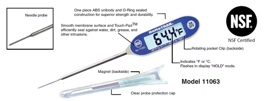 這個(gè)大屏顯示的防水溫度計(jì)是測(cè)量烹煮中和保溫中食物溫度的理想工具。根據(jù)FDA的食品法典第4-302條,,其探針針尖設(shè)計(jì)保證其快速的反應(yīng)時(shí)間,用以測(cè)量較小塊/片的食物。