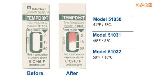 DeltaTrak提供滿足你各種需要的標(biāo)簽:WarmMark溫度標(biāo)簽、高溫?zé)針?biāo)簽和TempDot時(shí)間溫度指示標(biāo)簽顯示溫度變 化超過預(yù)設(shè)的時(shí)間。FreezeCheck和ColdMark溫度標(biāo)簽用于顯示運(yùn)輸溫度低于0℃。商業(yè)洗碗機(jī)使用的TempDot高溫?zé)針?biāo)簽可顯示最終沖 洗水溫是否達(dá)到71℃(HACCP體系所要求的溫度)。 TempDot時(shí)間溫度標(biāo)簽,型號(hào)51030-51032,,是一種低成本的標(biāo)簽,可顯示溫度高于閾值長達(dá)60分鐘。當(dāng)溫度超過臨界值,,標(biāo)簽顏色變化開始,但溫度下降到閾值之下時(shí),標(biāo)簽顏色變化停止,如此來顯示累積溫度超過的時(shí)間-,,對(duì)于許多質(zhì)保應(yīng)用來說,度分鐘是非常的重要的概念。有三種溫度閾值5℃、8℃和10℃可供選擇。 這個(gè)低成本標(biāo)簽可以指示一段長到60分鐘暴露在臨界點(diǎn)溫度。