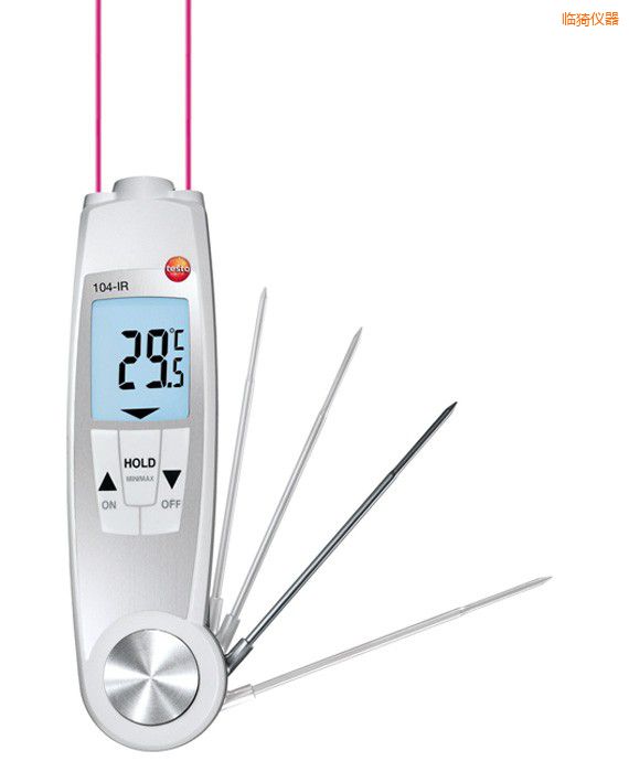 紅外及接觸式測溫二合一testo 104-IR配備精確的2點(diǎn)瞄準(zhǔn)激光,光學(xué)分辨率10:1,測量范圍清晰可見,可隨時進(jìn)行快速并精確的表面溫度測量。二合一溫度測量儀特別適用于食品進(jìn)貨檢測以及快速檢測單個或整箱食品的表面溫度。 刺入式溫度探頭適用于測量如肉類和香腸等食品的核心中心溫度。通常,在紅外表面溫度測量不足以判定食品安全的情況下使用。刺入式探頭在不使用時可通過折疊方式收入儀器中,以防折斷損壞。