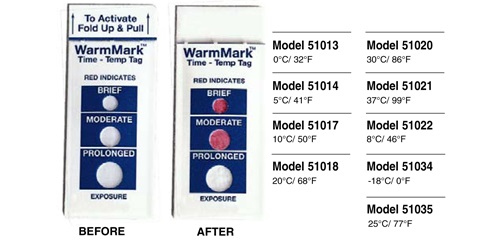 溫度指標(biāo)標(biāo)簽是體積小、成本低的溫度指示標(biāo)簽或時間/溫度標(biāo)簽,,使用于食品運(yùn)輸、儲存或處理過程。典型的用途包括監(jiān)測藥品、化學(xué)品和新鮮農(nóng)產(chǎn)品在運(yùn)輸過程中德溫度。如果溫度超出預(yù)設(shè)的限制之外,,標(biāo)簽顯示變色。 DeltaTrak提供滿足你各種需要的標(biāo)簽:WarmMark溫度標(biāo)簽、高溫?zé)針?biāo)簽和TempDot時間溫度指示標(biāo)簽顯示溫度變 化超過預(yù)設(shè)的時間。FreezeCheck和ColdMark溫度標(biāo)簽用于顯示運(yùn)輸溫度低于0℃。商業(yè)洗碗機(jī)使用的TempDot高溫?zé)針?biāo)簽可顯示最終沖 洗水溫是否達(dá)到71℃(HACCP體系所要求的溫度)。 WarmMark 溫度標(biāo)簽,,型號51013-51035,, 監(jiān)控產(chǎn)品在運(yùn)輸、 儲存或處理過程中的溫度。反應(yīng)溫度范圍可從-18℃至37℃。這些不干膠標(biāo)簽直接適用于產(chǎn)品、包裝、紙箱或大包裝上。一旦反應(yīng)溫度達(dá)到或超過,,標(biāo)簽便被激 活而發(fā)生不可逆變色。紅色顯示溫度的閾值外暴露經(jīng)過了一個短暫,,中等或長久的時間段。你一眼便能看出是否有溫度閾值外暴露發(fā)生,,提供質(zhì)量保證的永久記錄。