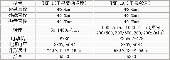 產(chǎn)品概述: TMP-1單盤雙速金相試樣磨拋機 •澳大利亞科學(xué)家smeuls提出凡是用固定磨料(如砂輪片、砂輪和金剛石磨盤以及各種砂紙)制備試樣的過程稱為磨光,金相拋光研磨機,凡是使用松散磨料(如加入各種磨料微粉懸浮液、噴霧拋光劑、拋光膏)制備過程稱為拋光。 •單盤雙速磨拋機(拋盤、研磨盤)就能完成各種試樣的粗磨、細(xì)磨、干磨、濕磨、研磨及拋光等各道工序。 •該機的磨拋盤直徑均大于國內(nèi)同類產(chǎn)品,金相樣品自動研磨機,有效增加工作面20-30%有更多不同線速度的選擇。 •本機可選擇安裝PD-1型推移器,金相切片研磨機,能替代手工進(jìn)行磨拋各道工序。 TMP-1A無級變速金相試樣磨拋機 •變頻調(diào)速,金相研磨機,試驗范圍自行設(shè)定。 •只需調(diào)換磨盤或拋盤和選擇合適轉(zhuǎn)速即可粗磨、細(xì)磨、干磨、濕磨、研磨及拋光等各道工序。 •傳動功率、磨拋盤直徑均大于國內(nèi)同類產(chǎn)品,全自動金相拋光研磨機,可增加有效工作面20-30%,金相試樣自動研磨機,可適應(yīng)不同材料的制備要求。 •本機可選擇安裝PD-1型推移器,金相研磨機價格,能替代手工進(jìn)行磨拋各道工序。 技術(shù)參數(shù):