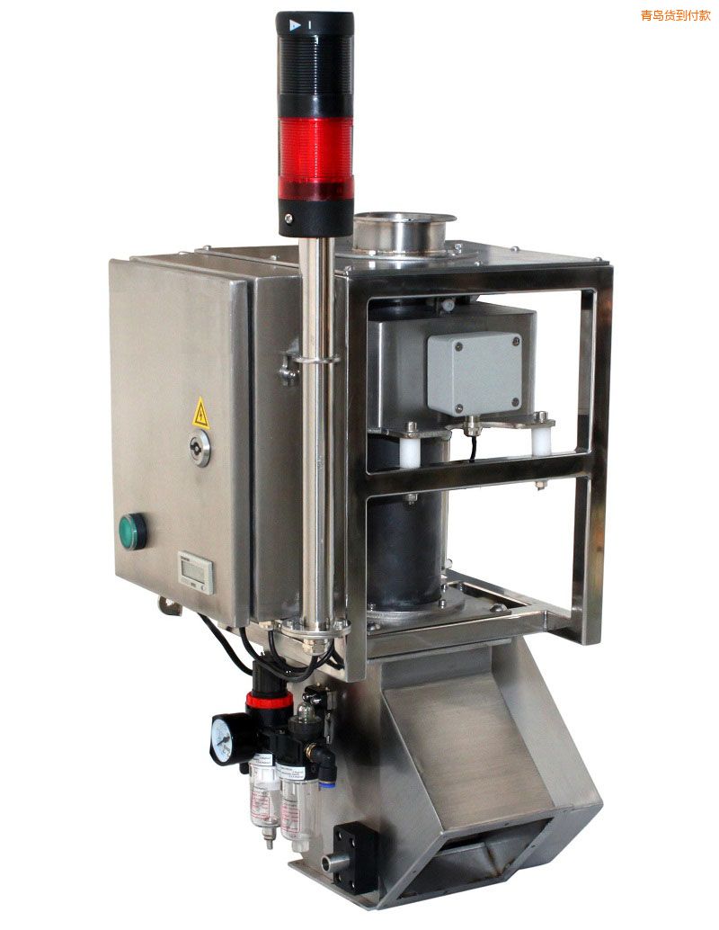 性能特點: 通過剔除系統進行快速剔除,能減少物料損失,不會干擾正常的生產過程。 檢測材料特性:散料(粉末、顆粒等),干燥,金屬檢測儀標準,流動性好 剔除方式:翻板自動剔除金屬雜質,食品專用金屬檢測儀,并聲光報警 靈敏度:可達Fe0.7mm,重金屬鉻檢測儀,SUS1.1 mm,非Fe0.75mm(更高可定制) 配有SMC氣缸、MAC電磁閥、計數器、空氣過濾器等 支架、料斗可根據客戶要求定做 防護等級:IP54