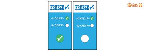 TempDot FreezeCheck標(biāo)簽,型號(hào)54000,,用來表示溫度低于0°C。如果溫度低于0°C,標(biāo)簽不可逆轉(zhuǎn)地發(fā)生變化,,變成白色,勾形標(biāo)記消失。 冷凍檢查標(biāo)簽用來指示溫度低于0°C. 當(dāng)溫度下降到低于臨界點(diǎn), 指示劑不可逆轉(zhuǎn)的改變從清晰到白色并且綠色合格標(biāo)志不再顯示。