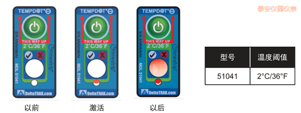 TempDot™ Minus標簽需存儲在室溫下,并且必須在反應溫度 以上被激活。激活是通過用手指推壓,標簽 底部的小窗口變?yōu)榧t色或部分變紅色以指示激活,,但激活后并不需要保持紅色。當使用了上述反應溫度 標簽的產品暴露于閾值以下的溫度,白色的大窗口變?yōu)榧t色或部分紅色,在反應溫度 以上將溫度標簽用 于產品。如果一個產品暴露于閾值以下的溫度,,白色的大窗口變紅色或部分紅色,TempDot™ Minus標簽 提供即時的視覺指示。為達到最佳效果,標簽應保持垂直位置,,其反應期間,,紅色箭頭須指向上方。
