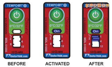 TempDot™Plus標簽應(yīng)存儲在室溫下,,并必須在反應(yīng)溫度閾值以上被激活。激活是通過用手指推壓。"On"字出現(xiàn)在第一個窗口中顯示激活。之后5分 鐘內(nèi),,在反應(yīng)溫度或低于反應(yīng)溫度的情況下將標簽貼到產(chǎn)品上。藍色染料熔化并以控制的速率遷移,經(jīng)過白色大窗口。這表示暴露在溫度閾值以上的累計時間。當(dāng)溫 度低于閾值時,該染料固化并停止移動。如果溫度超過閾值,,TempDot®Plus標簽提供即時的視覺跡象。